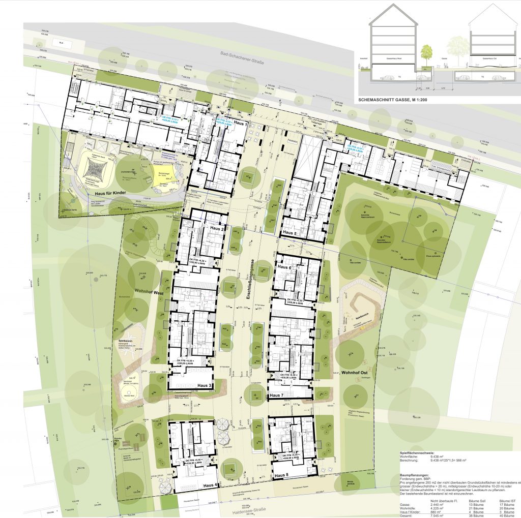 Insgesamt werden 8 Häuser geplant, wobei sich die Häuser 1 und 2 parallel zur Bad-Schachener-Straße erstrecken und die Häuser 3 bis 8 an der Gasse liegen. Die Gassenhäuser sind gemäß B-Plan bogenförmig in einzelnen Segmenten geplant. Die Nutzungen sind einkommensgeförderte Wohnungen (EOF), eine Kita sowie ein Bewohnertreff und eine Mobilitätsstation.